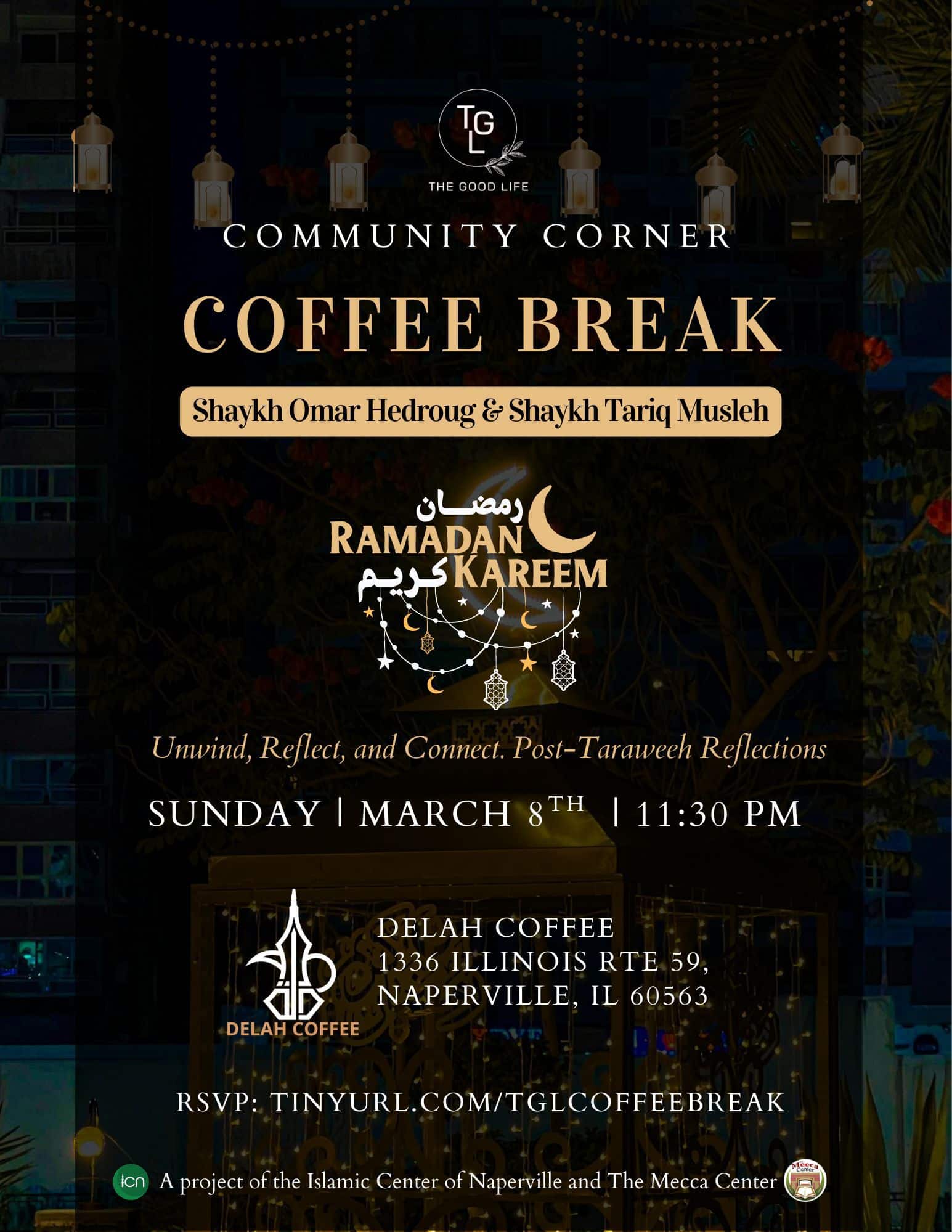 Unwind, reflect, and connect. Post-Taraweeh reflections Join us for Community Corner Coffee Break—an intimate post-Taraweeh gathering with Shaykh Omar Hedroug and Shaykh Tariq Musleh. Sunday, March 8 | 11:30 PM...