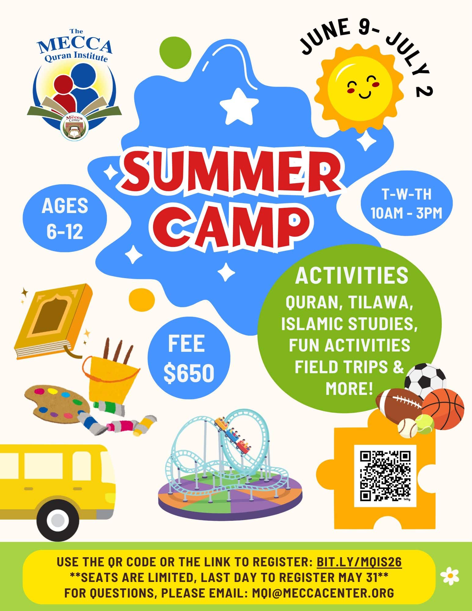 Join The Mecca Quran Institute Summer Camp for a fun and enriching program designed for children ages 6–12. Students will strengthen their connection with the Quran while enjoying exciting activities and field trips throughout the summer. June 9 – July 2 | Tuesdays, Wednesdays & Thursdays from 10 AM to 3 PM  Ages 6–12  $650...